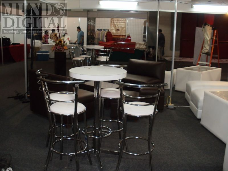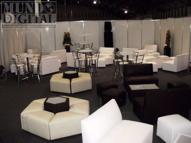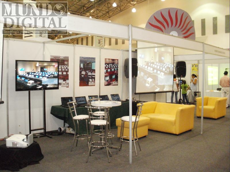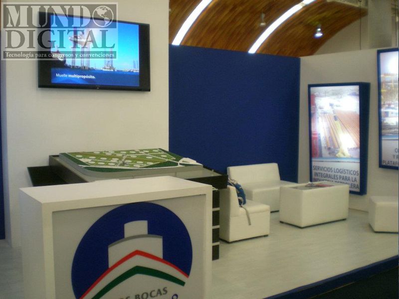 Pantallas de plasma, LCD o LED instaladas sobre la estructura del stand acondicionado para tal fin o sobre bases metálicas ya sea de acero tipo lounge o de metal pintadas en negro