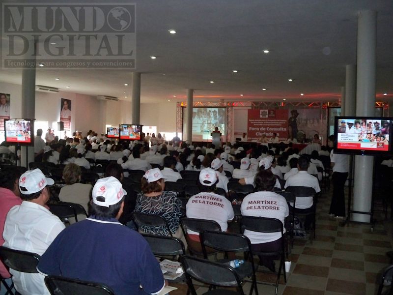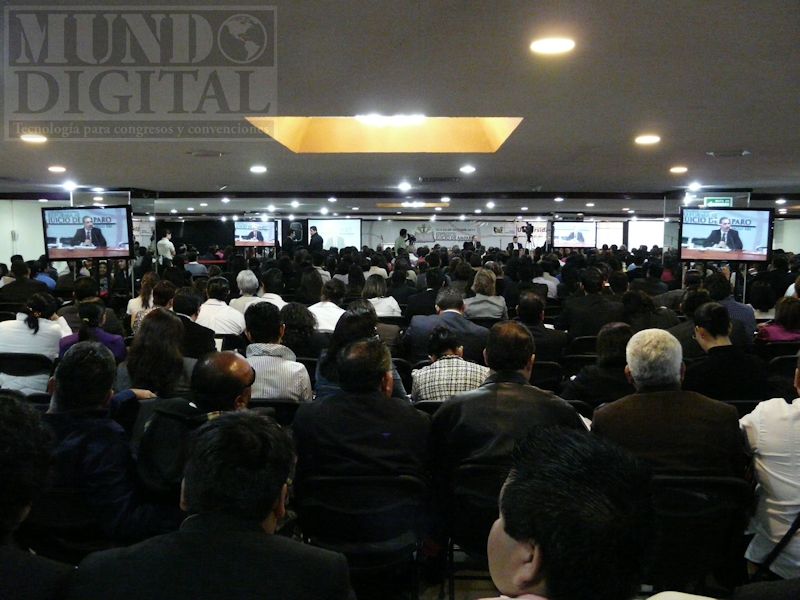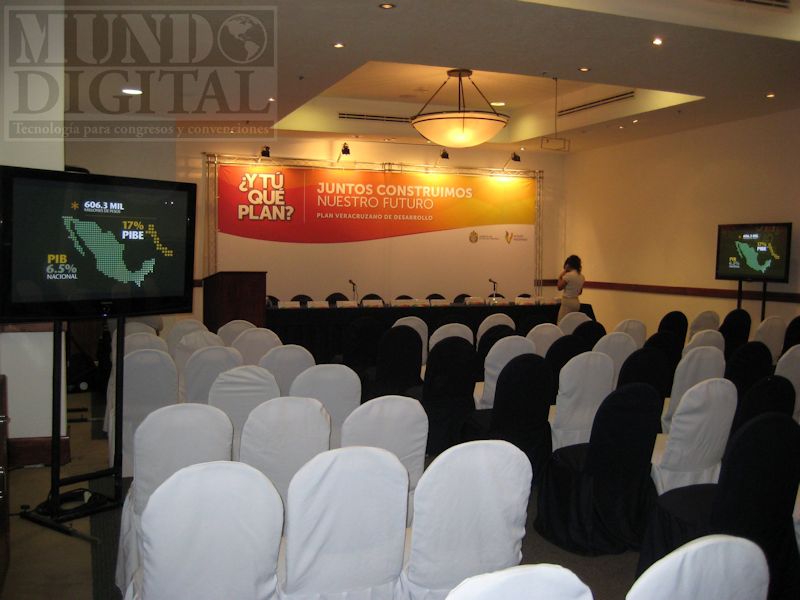 Puede complementarse con pantallas de proyección ya sea con una imágen complementaria o la misma imágem para el caso de una audiencia presente.